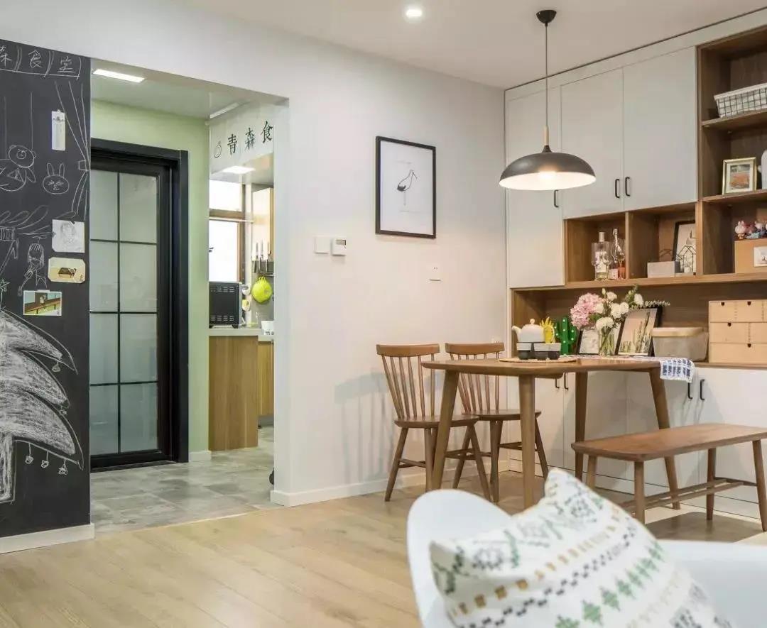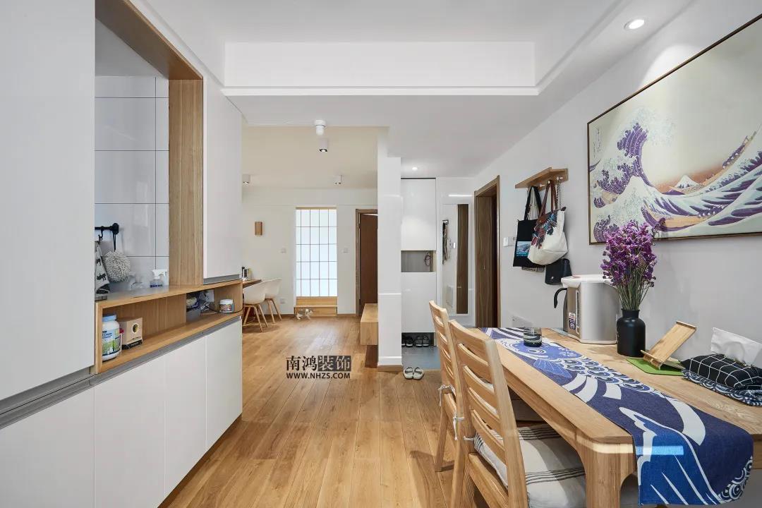 以白色背景為主,搭配木質(zhì)家具的日式風(fēng)餐廳,通過(guò)原木風(fēng)的餐桌椅和木白結(jié)合的餐邊柜,來(lái)展現(xiàn)日系的治愈基調(diào)。