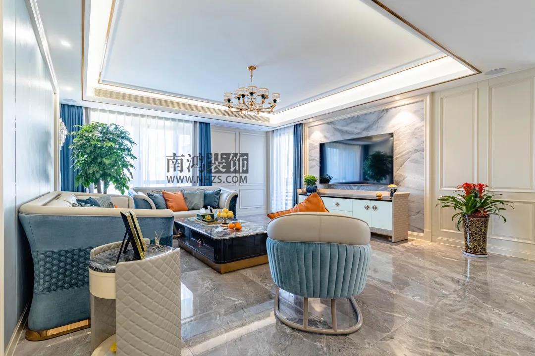 戶 型 圖 設計說明: 1、進門處拆除左墻,使父親房和客衛干區面積增大,并改變客衛進門位置,使得餐廳更加完整; 2、過道上的走入式衣帽間改成了兩個背靠背的柜子,不僅使房間增大,還多了一個書柜的空間; 3、母親房原本的房門直對過道,后更改了位置; 4、主臥改了衣帽間的朝向和主衛的墻,在保證空間的情況下滿足了業主儲物需求。 客 廳 客廳的地面選用深灰色拋釉磚,大理石材質的電視背景墻與之呼應。大面積藍色系的運用,使客廳空間透出清爽自然的氣息,背景墻、吊頂和家具中都加入了金色元素,透出優雅輕奢的味道。 沙發結合了皮革、布藝和絨面,溫暖舒適。桔色的抱枕作為跳色,為這方空間注入了活力和趣味,角落里的大盆綠植增添生氣。 客廳望向玄關視角。通透的空間感與視覺感令人無比舒適~ 餐 廳 餐廳延續了客廳的硬裝風格,與客廳之間毫無阻礙,動線流暢,開敞的空間還能帶給居住者更多有關美食的想象。 餐廳背景僅用一幅簡約藝術畫裝飾,兩側設計入墻式餐邊柜,實用且大方,并利用后陽臺的位置開辟了一個休閑吧臺的空間。 明黃的花色在這個純凈的視界中散發出鮮明而絢麗的審美意涵,讓屋主在芳香中品嘗人生百味~ 主 臥 主臥背景墻風格與客廳相似,又借暖色的床品顯現出空間個性,淺色木地板顯得溫潤而舒適。房間中還專門擺放了床尾凳,從細節上進一步提升空間品質。 兒 童 房 兒童房背景墻選用淺藍色墻漆裝飾,搭配多彩的窗簾和純白的高背床,簡約中勾勒出活力色彩。 兒童房進門一側多放了一個書柜,結合另一側的學習區,充分滿足孩子讀書時的日常需求。 衛 生 間 次衛一,做了干濕分離,暖灰色的墻磚與地磚呼應,視感舒服,高級灰的浴室柜挑空設計并點綴上金屬細節,時尚而前衛。 次衛二,采光充足,光線明亮,深藍的衛浴柜搭配金色拉手,顏值滿分。 | 地址:水景城豪苑 | 面積:250㎡ | 風格:輕奢 | 設計施工:浙江南鴻裝飾