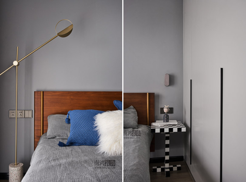 次臥以不同階度的灰色打造,色調(diào)統(tǒng)一的同時又巧妙劃出了層次,一角黑白塊樣式的小幾替代了床頭柜,是個小亮點。