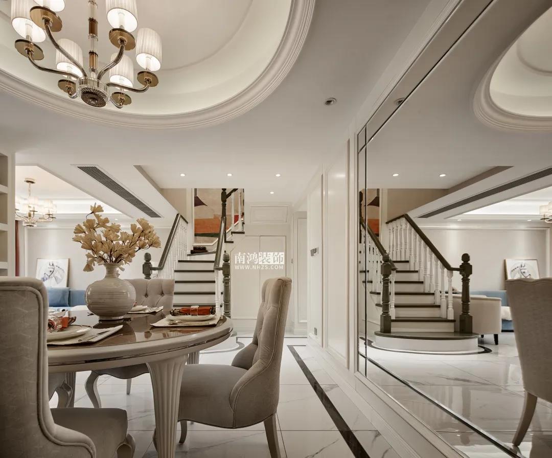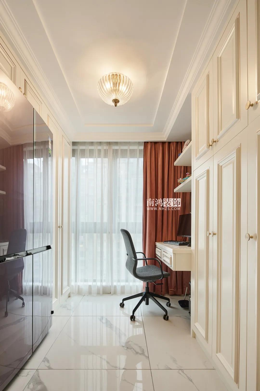 【項目·信息】 地址 / 名門世家 戶型 / Loft戶型 面積 / 139㎡ 風格 / 現代輕奢美式 設計施工 / 浙江南鴻裝飾 本案為業主朱女士的退休住房,平常是夫妻倆居住,女兒一家四口會偶爾過來。朱女士本人性格十分熱情開朗,喜愛旅游、運動,在房屋設計上要求明快而時尚的色彩搭配,以及足夠多的儲物空間。 本案在硬裝上是以實木復合木作和工藝皮革硬包為主要材質,家具軟裝則是在象牙白的基調上,添加入業主喜愛的亮麗色彩和具備現代感的輕奢元素,擯棄了厚重的外形表現,更加注重保留美式特有的溫情體驗。 · 一樓書房采用開放式設計,很好導引了采光。 · 調整了樓梯洞口的長寬與踏步尺寸,定制同色復古風扶手、踏步,讓樓梯區域看起來更有質感。 · 樓梯下方使用木飾面暗門,背后做儲藏室設計,增加儲物空間。 象牙白色,既溫暖又包容,低調而又內斂,作為室內的主基調是再合適不過了。 客廳以現代生活方式的簡約表現融合優雅的美式古典元素,成就別具一格的輕奢空間。 餐廳與客廳之間沒有隔閡,能實現更高的互動性。木質拼花圓桌與圓潤吊頂呼應,演繹出動人的空間韻律。 餐廳一側壁面以大幅鏡面元素裝飾,通過其反射光線的效果擴寬了空間的視覺維度,并極大增強采光。 書房做開放式設計,讓光線可以不受約束地傳遞到外部餐廳的位置,同時留出一部分柜體位置以嵌入冰箱,節省廚房空間。 樓梯洞口的長寬與踏步尺寸均得到精細調整,特意做舊的復古綠木扶手、踏步會更具質感和設計感。墻面定制抽象掛畫,跳躍的色塊激情傳遞著活力因子。 女業主的臥房,為貼合她熱情開朗的個性而選擇了愛馬仕橙的硬包背景來點亮整個室內空間,簡潔又不失格調。 為女兒準備的臥房,更能體現當代都市女性的審美需求。整體以沉穩的中性色為基調,搭配深藍色天鵝絨休閑椅和暗紫色絨布窗簾,富有層次感的色彩輕松打造出頗具藝術感的睡眠環境。