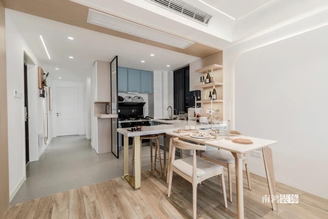 比如,開放式餐廚空間,讓餐廚兩塊區域的動線共享,實現“1+1>2”的效果,小戶型也能擁有一個比較寬松舒適的做飯、就餐空間。