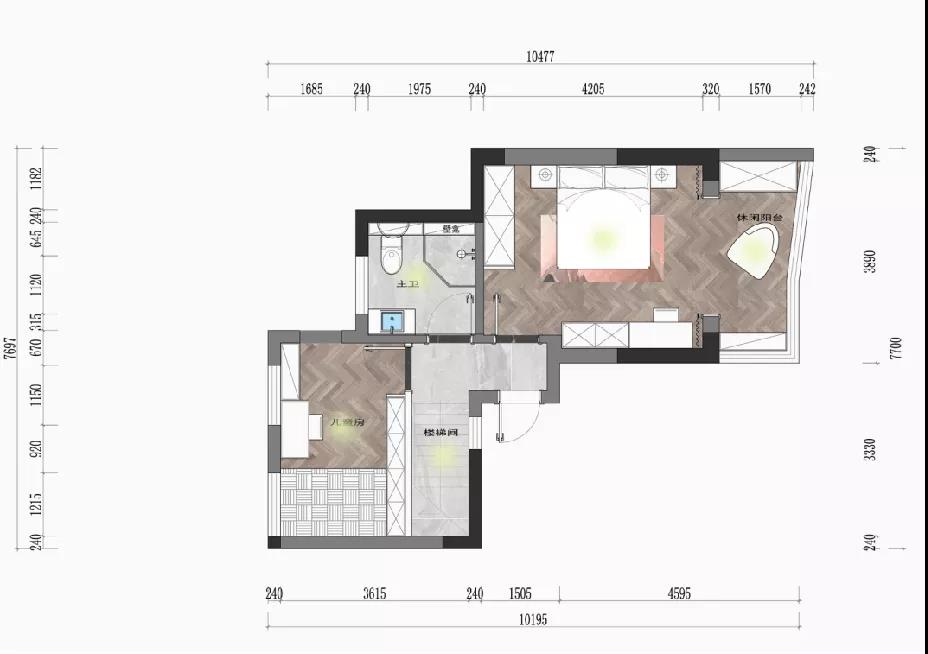 本案是一套現代輕奢風格的復式作品,業主夫妻二人,暫無小孩子,房間上除主臥之外,保留了兩個次臥做父母房和兒童房,一樓寬敞通透的開放式公區域設計成為本案一大亮點。 一層集合了日常所有的的煙火氣,蒸箱、烤箱、咖啡機、洗碗機、洗衣機...攜帶著一種隨性的自由,廚房到客廳依次構成白與黑、疏與密、放與收的過渡對比,層次感的疊加形成舒適的視覺體驗。 空間以暖調的木飾面色搭配黑白灰作為整體基調,簡約利落又不失家的溫馨。 戶型分析 ▼ 原始戶型存在一樓空間相對擁擠,樓梯陡峭,走起來費力,二樓空間利用率不高等問題。 1、樓梯位置調整,打造多個收納展示空間。 2、原有結構陽臺納入室內,擴大客廳使用面積和直接采光面。 3、廚房門洞改變方向,消除了原廚房與客餐廳的隔閡,打造一體化、全開放的格 局。 入戶區迎面而來一層開放大格局,往左為客廳,視野通透舒暢。定制儲物柜滿足基本的收納需求,色彩由淺入深,層次清晰分明,滿足功能的同時不失視覺美感。 青草綠點綴出小清新,柜內設計隱藏式燈帶,見光不見燈的效果,簡單一筆勾勒出空間輪廓與光影質感。 客 廳 LIVING ROOM 美觀大方的客廳空間,左右兩側維系著剛剛好的距離,溫和的底色在視覺上減輕了壓迫感。大理石與木飾面結合的電視背景,搭配硬包,皮藝沙發和單椅,顯出輕奢意味。 黑白灰三色搭配的餐廳空間,點綴的金屬材質點亮活力。開敞明亮的用餐環境,兩側都留有足夠大的通道距離,應對日常的社交聚餐可以說毫無壓力。 空間的時尚高級感,除了整體硬裝、家具的造型選擇之外,更重要在于細節的雕琢。由樓梯下來的白凈墻面,除了懸掛常規的裝飾畫外,由黑色線條勾勒的人像圖形也頗有趣味,讓人能感受到一種自在而愉悅的氛圍。 灰色向來是現代感家居的寵兒,沉靜色彩更能凸顯質感。 廚 房 KITCHEN 廚房與餐廳以玻璃門相隔,保持視覺的通暢,U型設計極大地提高空間利用率,洗菜、切菜、烹炒動線流暢,高效下廚輕輕松松。 主臥包入陽臺打造為休閑區,床頭背景清新的淺藍色與床品的灰色、單椅的橙色形成了具有層次感的溫馨格調。 床尾打造女主人的梳妝臺,豎線條裝飾營造縱橫維度的立體感,與留白的墻面相映襯,豐富了主臥空間的現代意象。 休閑陽臺除了一把單椅外,還有造型輕巧的穿衣鏡與掛衣架,生活的小確幸就在一點一滴的細節間把握。 長輩房藏在客廳隱形門背后,不增添過多修飾的空間更加簡約耐看,偶爾來小住的父母也有了私密的休憩之地。 長虹玻璃門引入外部光線,保證衛浴室的明凈感受。壁掛馬桶不留衛生死角,方便日常清潔。黑色的五金件隱隱占據視覺主導,將利落的現代感盡可能放大。